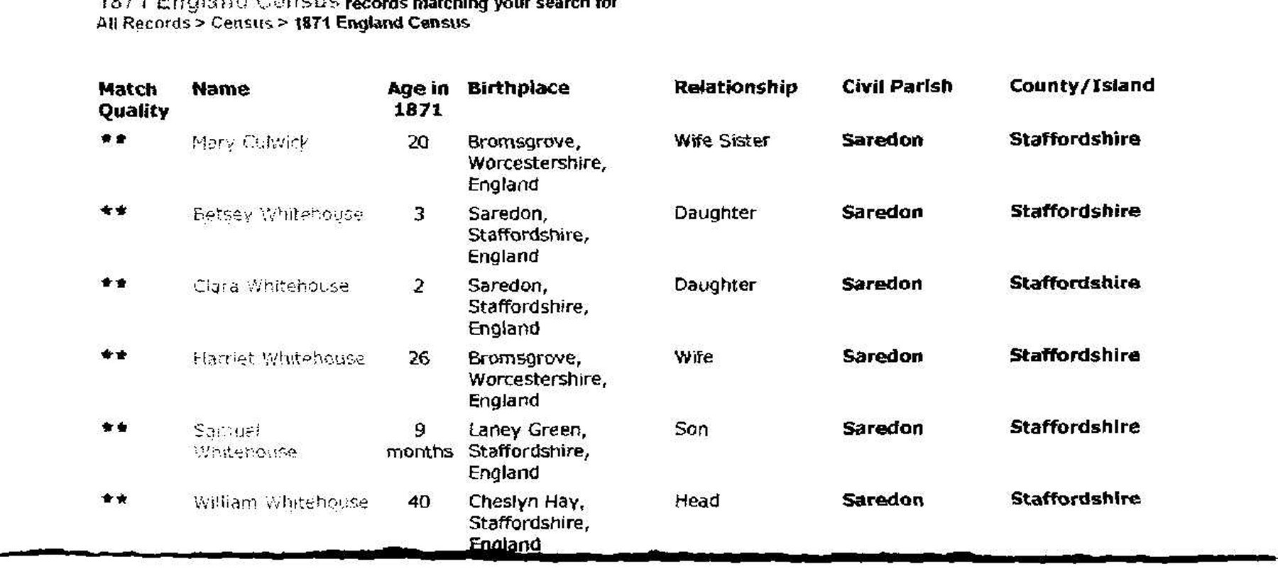 1871 census showing Mary Ann Culwick in household of her sister and husband Harriet and William Whitehouse